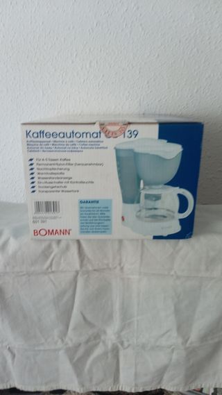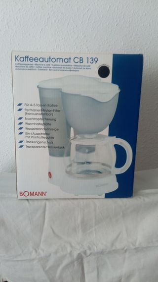 Cafetera de goteo Bomann CB 139, completamente nueva. Precintada (por ello no acepto devolución). Ideal para preparar de 4 a 5 tazas de café. Características en la última foto. Trato en mano, o envío por wallapop. Más artículos en mi perfil. - Jarra de vidrio. - Filtro permanente de nylon extraíble. - Placa calefactora. - Sistema antigoteo. - Interruptor de encendido/apagado con luz indicadora. - Depósito de agua transparente.