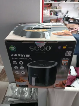Freidora de aire Sogo Digi Fryer 1200 con capacidad de 3.5 litros. Diseñada en España. Regalo de cumpleaños que se ha utilizado solamente 2 veces. Precio en Amazon: 79€!!!! - Potencia: 1200W. - 8 funciones preestablecidas. - Temporizador: 1-60 minutos. - Rango de temperatura: 80°C - 200°C. - Cesta antiadherente. - Aviso sonoro para remover la comida.