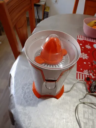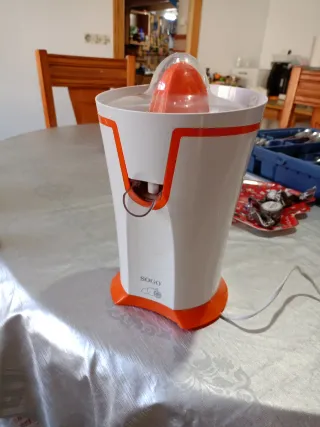 Exprimidor eléctrico Sogo con un diseño moderno en blanco y detalles naranjas, poco uso. - Cuerpo principal blanco. - Base y detalles naranjas. - Cono exprimidor.
