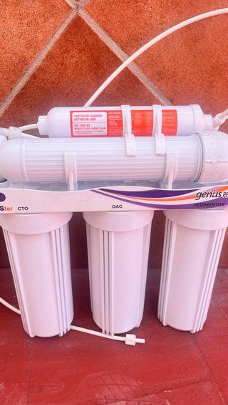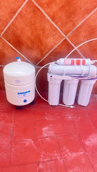Sistema completo de osmosis inversa para filtración de agua. Ideal para el hogar, acuarios, jardinería, etc. Funciona con la presión normal del agua corriente. - Triple filtración incluyendo carbón activado. - Mangueras de colores para facil conexión (blanco admisión de agua al sistema, azul salida de agua de osmosis, rojo desagüe de agua). - Incluye deposito de presión para almacenar el agua filtrada y todas las piezas y accesorios para su instalación. - Incluye grifo de salida y llaves para manipulación y limpieza de los filtros.