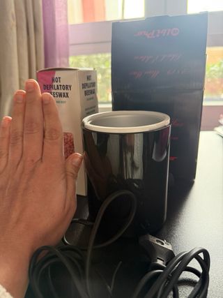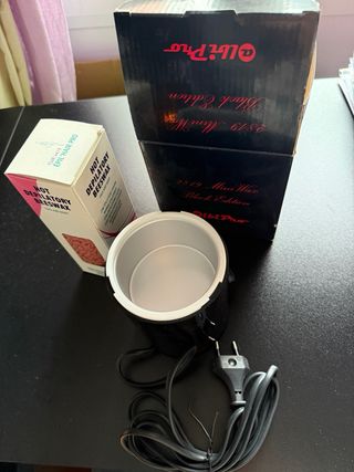 Maquina de cera caliente, perfecta por su tamaño para uso ordinario o para regalar. Nueva en su caja. Se incluye ademas un paquete de cera depilatoria caliente de 250gr.