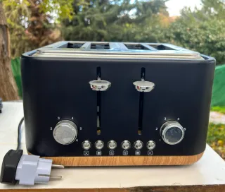 Tostadora de diseño moderno con acabado en negro y detalles en imitación madera. Cuenta con cuatro ranuras amplias para tostar diferentes tipos de pan. - Cuatro ranuras para tostadas. - Acabado en negro mate. - Base con efecto madera. No hago envíos.