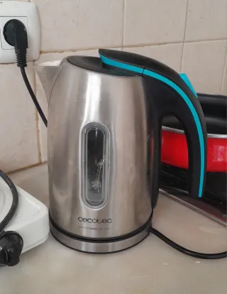 Es de acero inoxidable, se puede ver que teine un daño pero eso no influye en su funcionamiento. El hervidor funciona perfecto. Ubicación: ALHAURÍN EL GRANDE (MÁLAGA). Segundo piso.