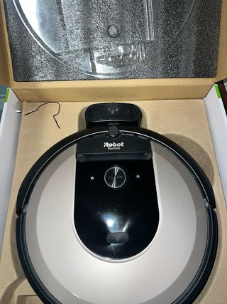 Robot aspirador Roomba en color negro y beige. - Diseño redondo. - Botón 'Clean' en la parte superior. - Indicadores luminosos.
