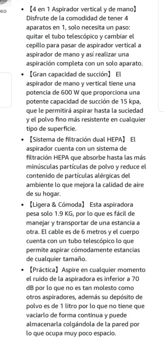 PRECIO NO NEGOCIABLE. BLOQUEO REGATEOS. NUEVO A ESTRENAR EN CAJA PRECINTADA. Aspirador de Mano y Vertical 4 en 1. Potencia 600W, 15 Kpa de succión. Filtro HEPA lavable. 4m de cable. Aspirador versátil que funciona como aspirador de mano y vertical. Incluye varios accesorios para diferentes usos. - Potencia de 600W. - Diseño cableado (4m de cable). - Incluye tubo de extensión, filtro y cepillo. DESCRIPCIÓN COMPLETA EN FOTOS.