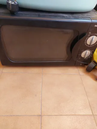 Microondas de color negro, perfecto para tu cocina. - Diseño compacto. - Mandos giratorios para ajustar tiempo y potencia.