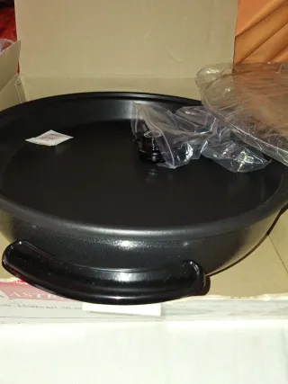 Cazuela eléctrica sin usar, lista para estrenar. - Color negro. - Asa lateral. Cazuela eléctrica nueva a estrenar incluye etapa cable y en su caja original E6 medidas 42 cm de diámetro x 10 cm de alto