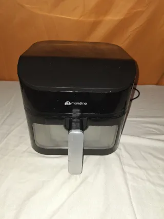 Freidora de aire de la marca Mandine en color negro. - Diseño compacto. - Asa plateada. - Ventana transparente para ver el interior. E8.medidas 28 centímetros de largo x 28 cm de ancho x 28 cm de alto