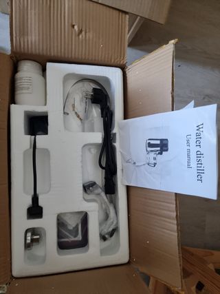 Sin estrenar, solo abierto para las fotos. Destilador de agua (4 L, acero inoxidable, 750 W, filtro de purificador de agua, con botella de colección.