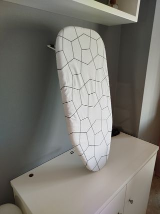 Tabla de planchar en buen estado. Es compacta y fácil de guardar. - Diseño moderno y elegante. - Estructura metálica resistente. - Funda de algodón con estampado geométrico.