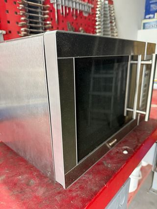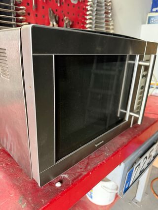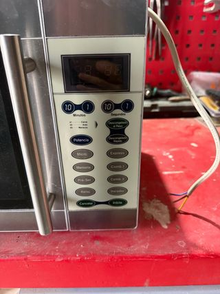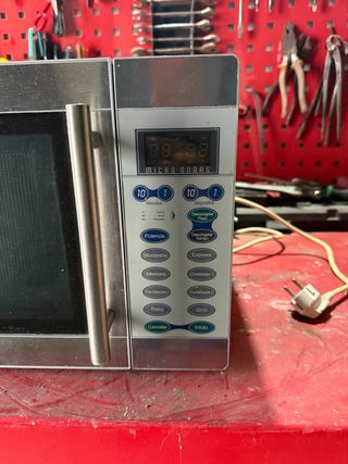 Microondas para piezas. - Panel de control con botones. - Pantalla digital. - Puerta con asa. - Cable de alimentación.