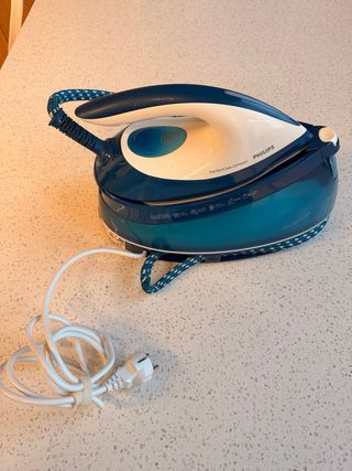 Plancha de vapor Philips PerfectCare Compact en color azul y blanco. - Diseño compacto y moderno. - Manguera de vapor con funda protectora.