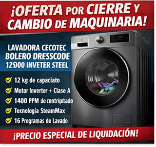 📌 Características Técnicas Principales Modelo: Bolero DressCode 12500 Inverter Steel Marca: Cecotec 🧺 Rendimiento y Funciones • Capacidad: 12 kg — ideal para familias grandes o cargas voluminosas (edredones, toallas). • Carga: Frontal • Velocidad de centrifugado: Hasta 1400 rpm. • Eficiencia energética: Clase A (con ahorro de energía significativo). • Consumo energía (programa eco 40-60): ~0,436 kWh. • Consumo agua por ciclo (eco 40-60): ~56 litros. • Ruido en centrifugado: ~76 dB(A). 🧠 Tecnología y Características Especiales • Motor Inverter Plus: reduce vibraciones, ruido y mejora eficiencia y durabilidad. • SteamMax: