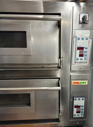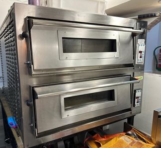 Horno profesional de acero inoxidable con dos cámaras de cocción independientes. Ideal para pizzerías y restaurantes. - Construcción robusta en acero inoxidable. - Dos hornos apilables. - Puertas con ventana de visualización. - Controles digitales de temperatura.