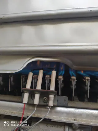 Calentador de agua a gas de la marca Nechar. Dispone de dos mandos giratorios para regular la temperatura y el caudal. - Marca: Nechar - Tipo: Calentador de agua a gas - Controles: Dos mandos giratorios