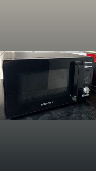 Microondas de color negro con acabado brillante y detalles plateados. - Marca: Ambiance - Puerta con ventana - Panel de control con dial y botones - Asa integrada para apertura