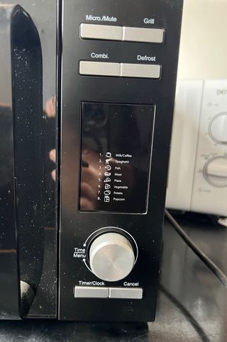 Microondas con función grill. - Color plateado y negro. - Panel de control con dial y botones.