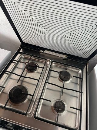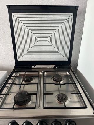 Cocina de gas con horno de acero inoxidable. Cuenta con cuatro quemadores y una tapa de cristal. - Encimera de acero inoxidable. - Tapa de cristal con diseño. - Cuatro quemadores.