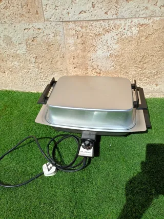 Sartén eléctrica vintage de la marca Lektro Maid. Un clásico para tu cocina. - Diseño de metal plateado. - Asas negras. - Control de temperatura.
