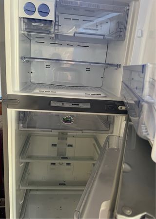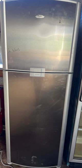 Nevera de dos puertas en color gris. Cuenta con un diseño moderno y elegante. Funciona muy bien - Acabado en acero inoxidable.