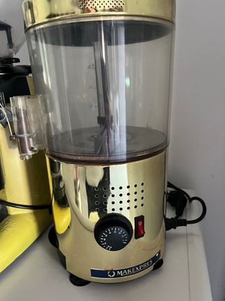 Máquina de chocolate con un acabado dorado brillante y diseño moderno. Ideal para preparar bebidas calientes. - Cuerpo metálico dorado. - Depósito transparente. - Control de temperatura. - Interruptor de encendido/apagado.