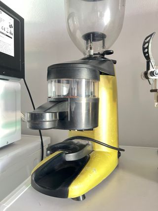 Molino de café con un llamativo acabado en color amarillo. Ideal para preparar café fresco en casa. - Depósito superior transparente. - Mecanismo de molienda visible. - Base negra con soporte para el portafiltro.