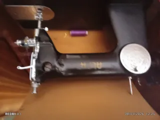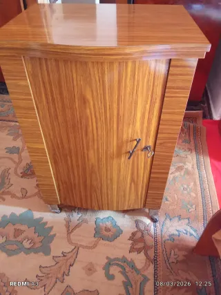 Mueble de madera con acabado brillante y diseño curvo. Ideal para guardar tu máquina de coser. - Patas con ruedas para fácil movilidad. - Puerta con tirador metálico.