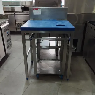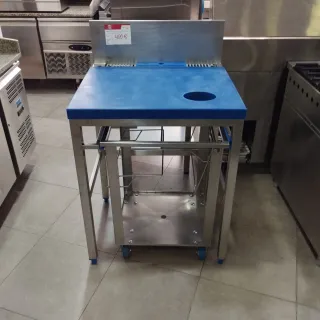 Mesa de corte profesional de acero inoxidable con tabla de corte azul. "¡Optimiza tu zona de corte con esta mesa de despiece profesional! Es la solución ideal para pescaderías, carnicerías y cocinas industriales. Fabricada en acero inoxidable de alta resistencia, cuenta con una robusta superficie de polietileno azul de gran espesor y un práctico orificio de desbarasado para mayor higiene. Incluye un soporte inferior con ruedas para un manejo ágil de los residuos. ¡Durabilidad y eficiencia para tu negocio!" #mesadedespiece #pescaderia #carniceria #hosteleria #maquinariadehosteleria #aceroinoxidable #equipamientogastronomico