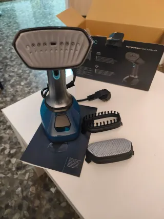 Planchadora vertical de la marca Cecotec, color azul y gris. - Incluye cepillo accesorio. - Base para colocar la planchadora. - Manual de instrucciones.