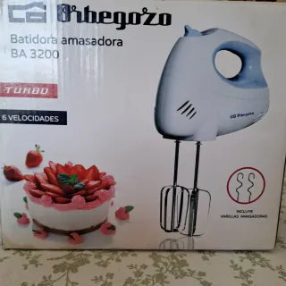 Batidora amasadora de la marca Orbegozo, modelo BA 3200. Es un electrodoméstico práctico para la cocina. - Incluye varillas para batir y mezclar - Incluye ganchos para amasar - Cuenta con 6 velocidades. - Función Turbo.