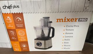 Picadora de cocina Chef Plus Mixer Pro en excelente estado, casi nueva. Ideal para preparar tus recetas favoritas. - Bol de 3.500 ml. - Jarra de 1.800 ml. - Molinillo de 650 ml. - Potencia de 800 W. - Velocidad variable. - 3 programas: Pulse, Pica hielo, Smoothie. - Funciones: Corta/Pica, Tritura, Amasa, Lamina, Ralla, Bate, Monta, Muele. Chef Plus Essential es un extractor de zumos que funciona con la técnica de prensado en frío, gracias a la poca velocidad a la que gira su multiprensador. Esto mantiene intactos los nutrientes, las enzimas y todas las propiedades. Consultar en Chefplus.es