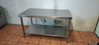 Mesa de trabajo de acero inoxidable, ideal para cocinas o talleres. - Superficie lisa y resistente. - Estructura robusta de acero. - Bandeja inferior adicional. Compra y venta de todo los muebles de Hosteleria restaurante bar obrador, carnicería, pastelería, supermercados ,de todas las marcas infrico ,coreco, docriluc,Nevera ,vitrina expositora ,congelador de 4 caras, cafetera ,molinillo ,botellero, cocinas, plancha ,freidora, sillas mesas, máquina de hielo, amasadora batidora,mesas de trabajo acero inoxidable,freidoras de gas ,freidora eléctrica, Consulta sin compromiso 677572927