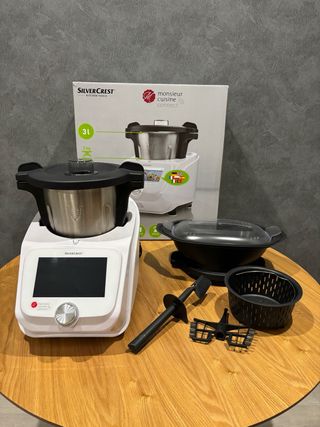 Robot de cocina multifunción Silvercrest Monsieur Cuisine Edition Plus. - Panel de control con pantalla. - Múltiples funciones y programas. - Diseño moderno en color blanco y plateado. - con complementos incluidos ( se pueden vender aparte tb) **falta la pieza que hace que se mueva las cuchillas, se puede comprar o hacer en 3D. Utilizado solo para picar, partir y alguna vez cocinar, pero no mucho uso.