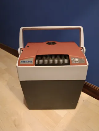 Nevera portátil de la marca Mobicool con un diseño práctico y funcional. - Color principal gris oscuro. - Tapa superior en color salmón. - Asa de transporte plegable. -Alimentacion de 12v vehículo y 220v , ideal furgoneta camper -Entrada USB tapa superior