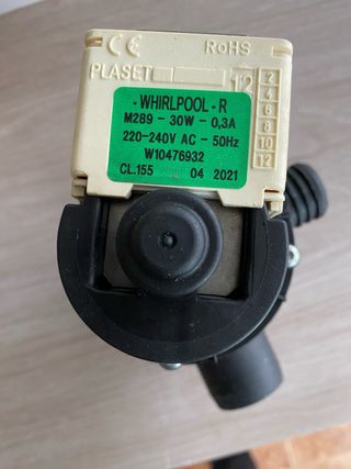 Bomba de agua para lavadora whirpool nueva a estrenar. - Fabricada en plástico negro resistente. - Conexiones para mangueras. - Conector eléctrico. Posiblide usarla también para bombeo en una huerta.