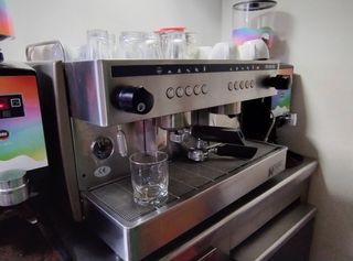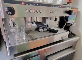 Cafetera profesional Rimini de acero inoxidable. Ideal para negocios o amantes del café. - Dos mandos, uno individual y el otro doble - Tapa ciega para limpieza de las bocas de café - Un mando no funciona, esta arascado.