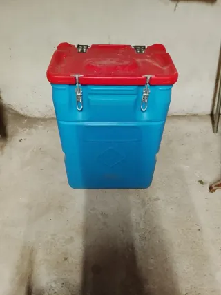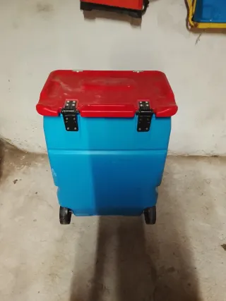 Contenedor de plástico con tapa roja y cierres metálicos. Para productos químicos. - Color azul principal. - Tapa de color rojo. - Dos cierres de seguridad metálicos.