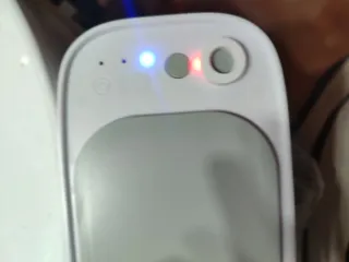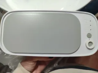 Dispositivo de limpieza ultrasónica portátil con diseño moderno. - Acabado en blanco y gris. - Botones de control táctiles. - Indicadores LED de tiempo.