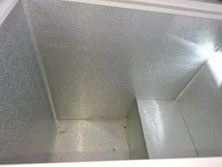 Congelador horizontal con puertas correderas. - Color blanco con borde azul. - Ruedas para fácil movilidad. - Rejilla de ventilación frontal.
