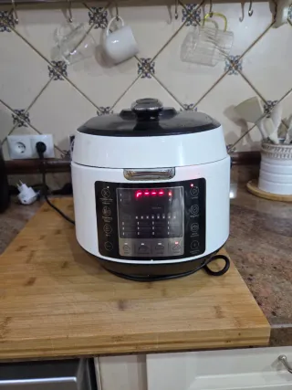 Olla eléctrica de cocina con panel de control digital. - Diseño moderno en blanco y negro. - Panel de control con pantalla LED. - Botones táctiles para selección de programas.
