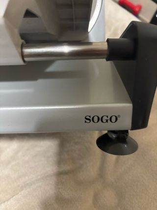 Cortadora eléctrica de alimentos SOGO, ideal para charcutería y uso doméstico. Su diseño plateado y negro le da un toque moderno. - Cuchilla de acero inoxidable. - Bandeja de corte. - Protector de cuchilla.