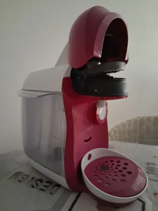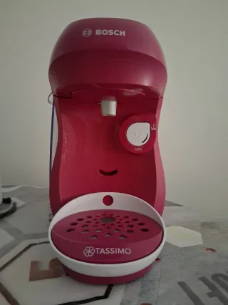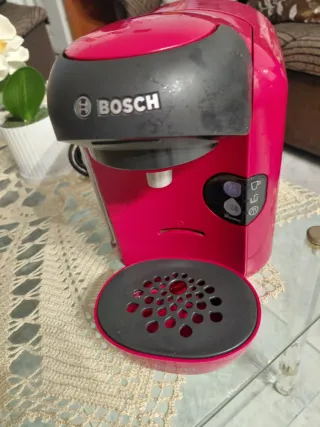 Cafetera compacta y moderna de la marca Bosch, modelo Tassimo, en un llamativo color rosa. Ideal para preparar tus bebidas favoritas. - Diseño compacto. - Color rosa vibrante. - Marca Bosch Tassimo.