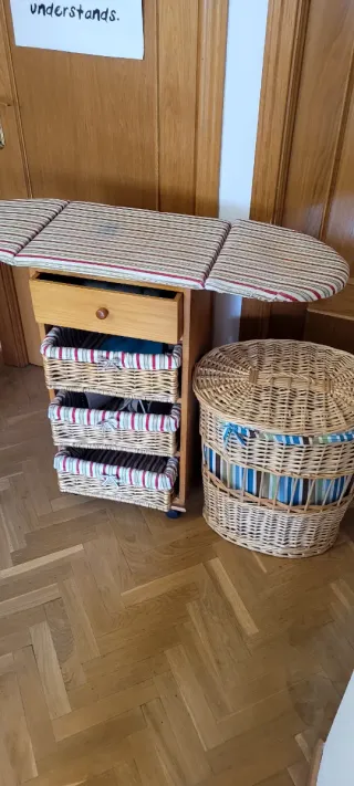 Mesa de planchar con 4 cajones la parte de aplanchar se puedw cerrar. de madera con un canasto de ropa. - Canasto de mimbre con forro de tela a rayas. - Cajón superior. - Ruedas para facilitar el movimiento.