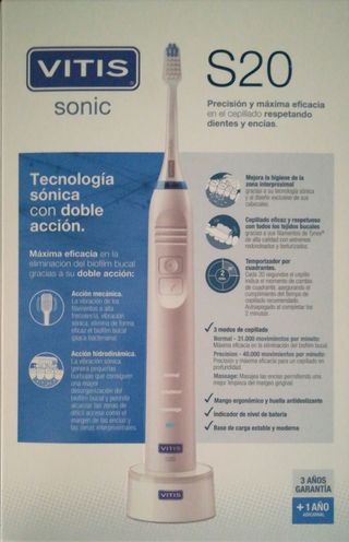 Sin estrenar con precinto de caja. Cepillo dental eléctrico Vitis Sonic S20 con tecnología sónica y doble acción: - Tecnología sónica con doble acción. - Máxima eficacia en la eliminación del biofilm bucal. - Acción mecánica y acción hidrodinámica. - Mejora la higiene de la zona interproximal. - Cepillado eficaz y respetuoso con los tejidos bucales. - Temporizador por cuadrantes (2 minutos). - 3 modos de cepillado: Normal, Precision y Massage. - Mango ergonómico y huella antideslizante. - Indicador de nivel de batería. - Base de carga estable y moderna.