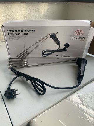 Calentador de inmersión de la marca Goldman. - Elemento calefactor de espiral metálica. - Mango de plástico negro. - Cable de alimentación con enchufe.