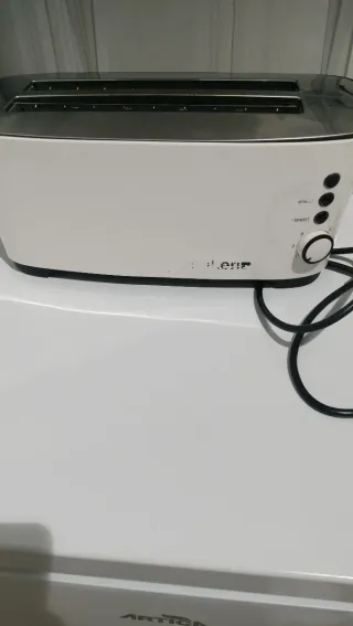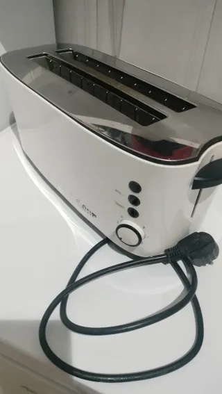 Tostadora de color blanco con acabado metálico en la parte superior. - Ranuras para tostar. - Selector de tostado. - Botones de función.
