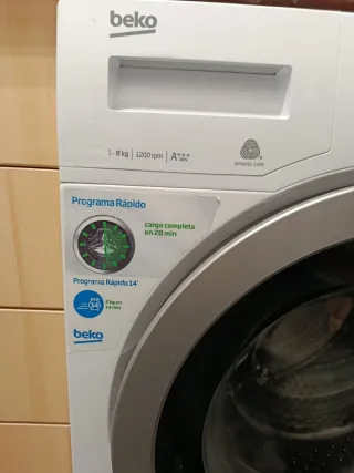 Lavadora Beko con tecnología ProSmart Inverter. Categoría A+++ - Capacidad de carga de 8 kg. - Velocidad de centrifugado de 1200 rpm. - Programa Rápido de 20 minutos. - Programa Rápido 14. Solo venta 24 horas desde colgar el anuncio ya que nos traen la nueva sino se la lleva media markt :)
