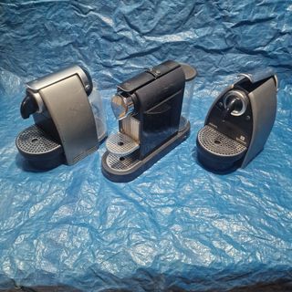 La cafetera de la izquierda no enciende, la de la derecha enciende y se escucha el motor pero no sale agua, y la del centro enciende y se oye el motor pero no sale el agua por su sitio. Las 3 maquinas para reparar o para piezas. Las 3 por 35€.