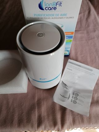 Purificador de aire pequeño, recargable, con dos intensidades y tenue luz azul opcional, silencioso. Marca longfit care. Filtro hepa. Elimina alérgenos, polvo y olores.