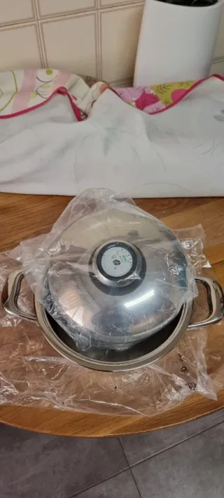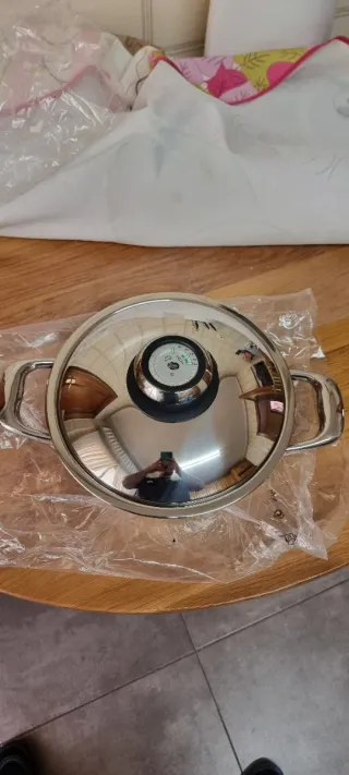Olla de acero inoxidable con tapa y medidor de temperatura. - Diámetro: 20 cm. - Capacidad: 2.3l Litros. - Material: Acero inoxidable.